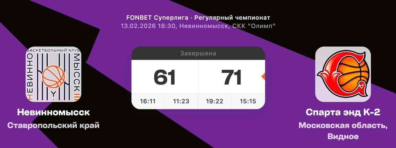 13 февраля FONBET Суперлига: "Спарта энд К-2" побеждает на выезде в Ставропольском крае! Счет встречи против "Невинномысска" - 61:71 (16:11, 11:23, 19:22, 15:15) ✊