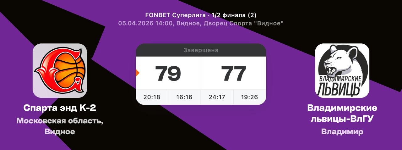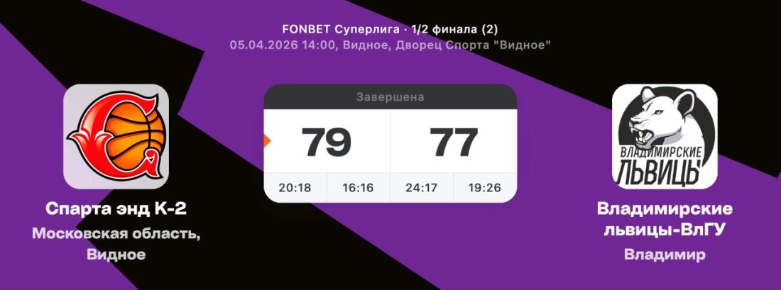 5 апреля FONBET Суперлига: "Спарта энд К-2" повела в полуфинальной серии против Владимира, выстояв в горячей концовке! Счет битвы в Подмосковье - 79:77 (20:18, 16:16, 24:17, 19:26).